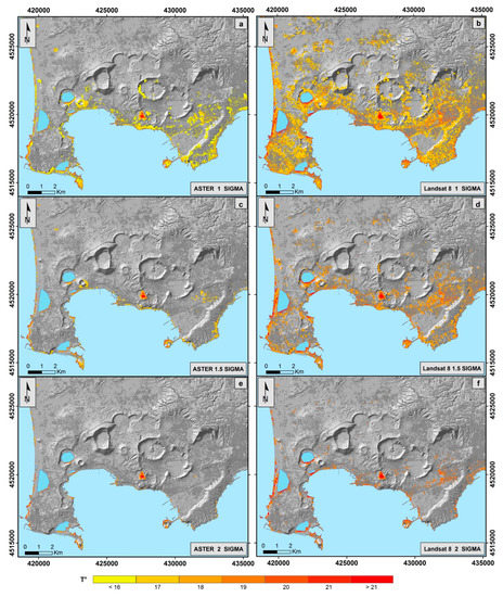 The MTTV map of Figure 10a, obtained by using the 1σ threshold value of the ASTER frames, show clusters of pixels characterized by high temperatures along the coastal line, volcanic edifices and urbanized areas. In Figure 10c (threshold value = 1.5σ) high temperature pixels are located mainly over the volcanic edifices of Solfatara and Monte Nuovo (see Figure 1) and subordinately along coastal lines. Also, a few pixels are located near highly urbanized areas. In Figure 10e, only the Solfatara volcanic area and a few coastal places are highlighted by high temperature pixels. Landsat 8 maps of Figure 10b,d,f show similar behaviour as the ASTER maps, although the number of high temperature pixels is considerably greater, likely due to the different IR sensor sensibility.
