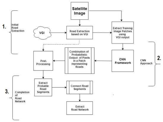 In our earlier work, we worked on extraction of roads guided by Volunteered Geographic Information (VGI) [1]. VGI is collected using crowd-sourcing tools which allow general public to contribute towards a global database that contains geo-referenced data about the Earth’s surface. OpenStreetMap (OSM) is one such example, which provides spatial, geometrical, and attribute information about road networks, building footprints, landmarks, etc. In the case of roads, VGI data is often provided only as vector data represented by lines and not as full extent. Also, depending the geo-registration accuracy of the base maps, the VGI data can consist of significant errors. Our previous approach works based on the assumption that road segments are always connected with local geometrical homogeneity. By using the direction of the segments in VGI, we extract the full extent of the roads in the remotely sensed images. However, the limitation of this VGI-only approach is its inability to update the new road developments which are not captured in VGI; In this paper, we introduce an approach based on Convolutional Neural Network (CNN) to extract the complete network by also extracting segments that are not available in the VGI. The output of the first stage where VGI is used to extract the full extent of the road is employed as a labelled class input to train the CNN in the second stage. Furthermore, post-processing is performed to correct undesired non-road artifacts such as buildings, vegetation, occlusions, etc. In the third stage, we develop a graph-theoretic approach as a post-processing step to enhance the accuracy of the extracted road network by connecting disjoint road segments.