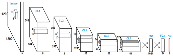 In this work, we use a CNN model consisting of five convolutional and two fully connected layers (as shown in Figure 3) whose structure is expressed as: CL(5 × 5, 3, 8) - CL(3 × 3, 8, 8) - CL(3 × 3, 8, 16) - CL(3 × 3, 16, 32) - CL(3 × 3, 32, 64) - FC(1024, 64) - ReLU - FC(64, 2).