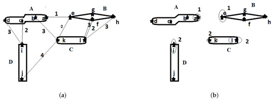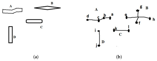 Illustration of nodes in Road Segments. (a) Example of road segments detected by machine learning approach; (b) Skeleton of the road segment after thinning process with nodes as the end/branch points, where star denotes the nodes represented by alphabets.