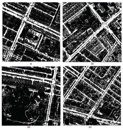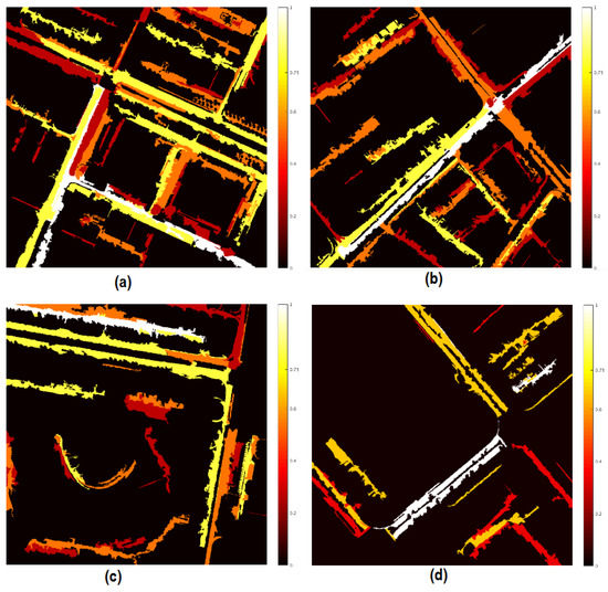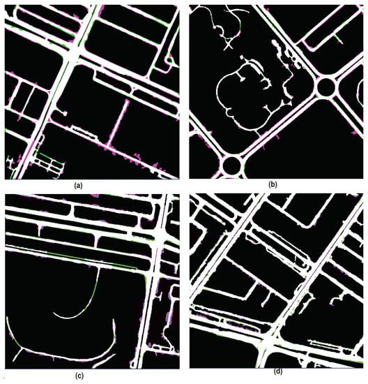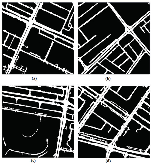 Output of road extraction using the approach of Li et al. [38] with a probability map; (a) Image 1, (b) Image 2, (c) Image 3, and (d) Image 5.