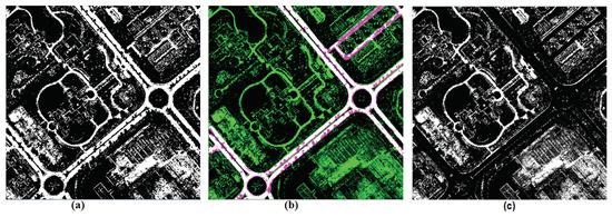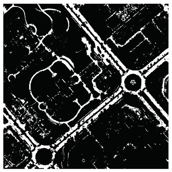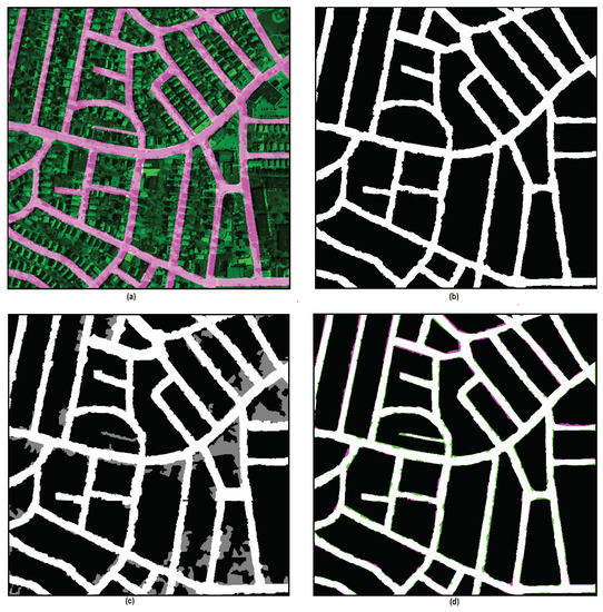 Pixel-based performance measures such as accuracy, precision (correctness), recall (completeness), and F1-score are determined to assess the quality of the results. A false positive () is defined as an “over detection” where an actual non-road pixel is detected as a road pixel by our method. A false negative () is defined as an “under detection” where an actual road pixel is left out as a non-road one by our method. A true positive () (true negative () respectively) means that an actual road as well as non-road pixels are correctly identified.