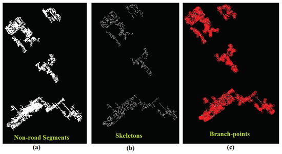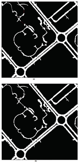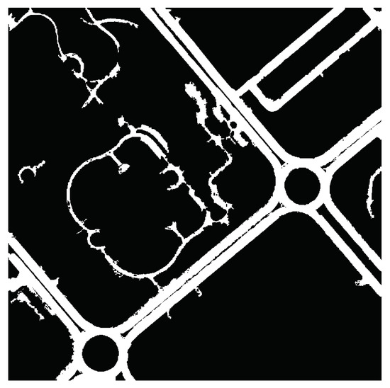 The output obtained from CNN is available in both ‘8 × 8’ patch size format as well as probabilistic value at a pixel level (i.e., probability of pixel representing road). Here, with rigorous observation over several sample patches, a threshold of 0.90 is chosen and then used at the patch level to get the final output from CNN framework (i.e., we treat a patch as road only if it contains more than 1/4 of its constituent pixels’ value to be equal or greater than 0.90). With the use of 0.90 as a threshold value, noise is reduced to a great extent. Then, the buildings from the output are removed as explained in Section 3.2.2. We then perform morphological opening and closing using a square structuring element of size ‘5 × 5’ to further smooth the result. To remove other occlusions such as non-road segments, analysis of branch points to its segment area is performed. By comparing the ratio of count of end points to its object’s area, we were able to separate out the non-road segments from actual road segments with a threshold value of 0.0025 obtained by analysis of road and non-road segments in test images.