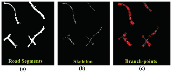 Consider an example consisting of four road segments, as shown in Figure 4a. We first define the nodes by extracting the nodes in each segment with the help of end points/branch points of the skeleton of the road segments, as shown in Figure 4b. Once, we extract the nodes, we look at each node within a segment and associate that node with a cost value, which is based on minimum distance from that node to the other node in the unconnected segment, as shown in Figure 5a.