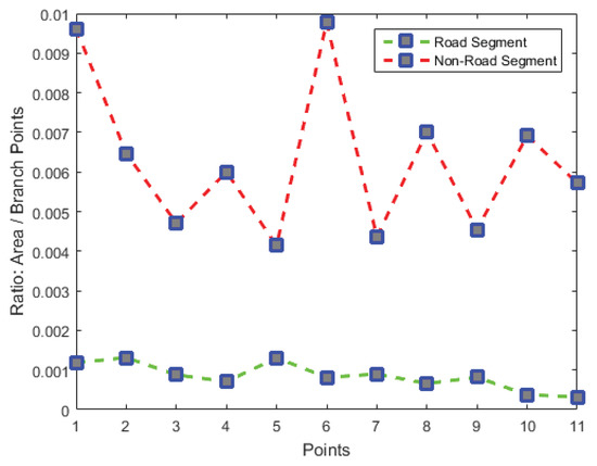 Analysis of ratio of the number of branch points to the area of the extracted segment to determine the road segments.