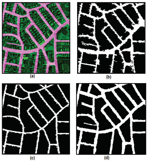 Comparison of outputs: (a) Part of Massachusetts data shown in Fig. with its ground truth, (b) Output using method of Sujatha and Selvathi [39], (c) Output using method of Alshehhi et al. [31], and (d) Output of proposed method.