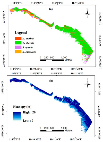 The classification of mangrove species (a) and canopy height model (CHM) (b) of the study area.