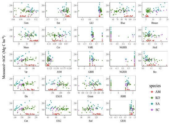 Figure 4 presents scatterplots between three kinds of variable (texture features, VIs, and height metrics) and the measured AGC values of different species. Because texture features show high correlation with window size, we chose a window size of 19 × 19 to plot. As Figure 4 shows, the spectral signals, such as Green leaf index (GLI), Visible atmospherically resistant index (VARI), Green blue ratio index (GBRI), Normalized green-blue difference index (NGBDI), Normalized green-red difference index (NGRDI), Red-blue ratio index (RBRI), and Green-red ratio index (GRRI), of the UAV orthoimage tended to saturate with AGC in mangrove forests with such dense canopies.