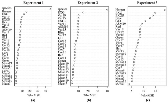 Figure 5a shows the 30 selected variables (from the 88 input variables) used for the AGC estimation, as determined with the Boruta method. The %IncMSE is the increase in the mean square error (MSE) of the predictions, which represents each variable’s importance value in the RF model. In Experiment 1, 30 selected variables were put into the RF model, where the most important variable was species followed by Hmean, Excess green index (EXG), and Variance19 (Var19) (Figure 5a). In Experiment 2, 28 selected variables, excluding Hmean and Hcv, were put into the RF model, where species was most important variable, followed by EXG, Var19, and Variance13 (Var13) (Figure 5b). In Experiment 3, 29 selected variables, excluding species, were put into the RF model, where Hmean was the most important variable, followed by EXG, Excess green minus excess red index (EXGR), and Blue (Figure 5c). The selected variables were then used to build the ANN and SVR models for mangrove AGC estimation in each experiment.