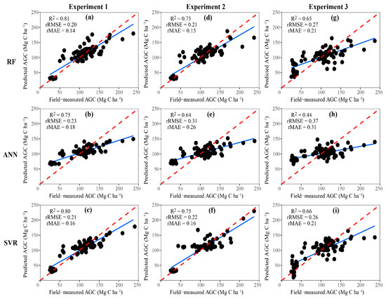 Overall, as shown in Table 4, the RF model in Experiment 1 showed the best accuracy and successfully explained 81% of the variance of the field-measured AGC values, with rRMSE = 0.20 and rMAE = 0.14. The models in Experiment 1 showed the best performance among the three experiments; this meant the four variable types considered in the models, including species, height metrics, Vis, and texture features, were suitable for AGC estimation. In addition, by comparing Experiment 2 with Experiment 3, and the importance values of the variables in Figure 5a, species was more important than height metrics. As for the model comparison, the RF models had better performance than the SVR and ANN models. This indicated that the RF algorithm was more useful and robust than the SVR and ANN algorithms for AGC estimation. The correlation between field-measured AGC and predicted AGC from the regression models are displayed in Figure 6.