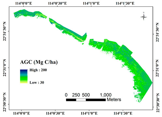 Finally, an AGC map of mangrove forests in the study area (Figure 7) was produced based on the RF model from Experiment 1 (Table 4) and the 30 selected variables shown in Figure 5a (R2 = 0.81, rRMSE = 0.20 and rMAE = 0.14). The estimated AGC values of the K. obovate assemblage were the highest, followed by the S. apetala and S. caseolaris assemblages. The AGC values of the A. marina assemblages were the lowest (Table 5). Overall, the average estimated AGC was 93.0 ± 24.3 Mg C ha−1, which ranged from 31.7 Mg C ha−1 to 195.8 Mg C ha−1, while the total estimated AGC was 7903.2 Mg within the 85-ha mangrove forest (Table 5).