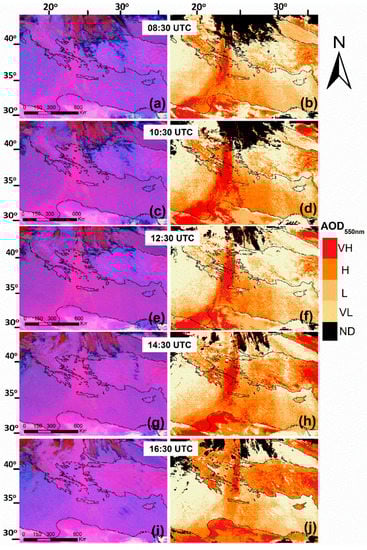 - Kerkman, J.; Roesli, H.P.; Bridge, G.; König, M. Applications of Meteosat Second Generation (MSG), RGB Composites with Channels 01–11 and Their Interpretation. Available online: http://oiswww.eumetsat.org/IPPS/html/bin/guides/msg_rgb_dust.ppt (accessed on 5 June 2018).
