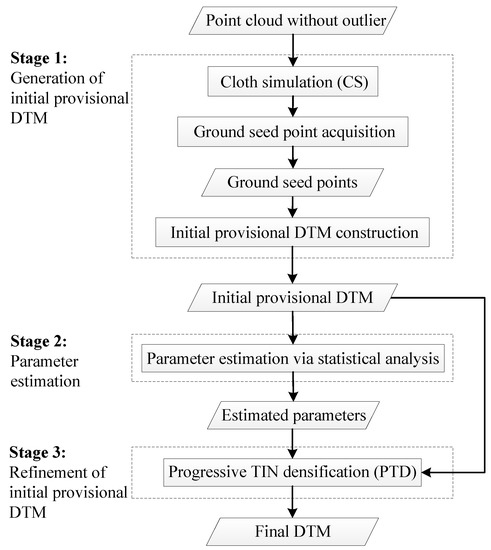 A series of critical improvements are implemented to increase the accuracy and practicality of CSF and PTDF in this paper. First, we use CS to select the ground seed points instead of using the lowest points in a user-defined grid cell. This algorithm provides more ground seed points that are almost evenly distributed in general, thereby generating a high-quality initial provisional DTM. Second, parameter thresholds (i.e., the maximum angle (θ) and the maximal terrain slope (s)) for PTD are derived from the initial provisional DTM based on the statistical analysis theory to improve the automation of the filter. Third, the initial provisional DTM is refined by PTD with adaptive parameter thresholds. The entire workflow is composed of three parts, i.e., generation of initial provisional DTM, estimation of parameter thresholds and refinement of the initial provisional DTM, as shown in Figure 3.