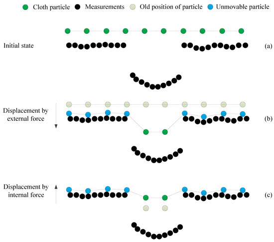 When the cloth drops to the inverted measurement surface, the displacement of each cloth particle only under the external force is computed by Equation (2).