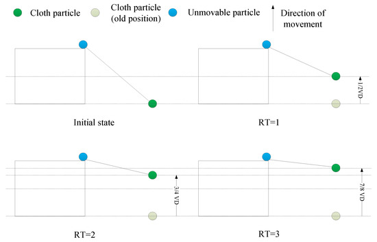 where is the displacement vector of a particle, is zero when the particle is unmovable, otherwise it equals to one, represents the position of the current particle, represents the position of the neighboring particle that connects with , and represents a normalized vector that points to the vertical direction, . RT is the repeated time that controls the rigidness of the cloth. As shown in Figure 5, when RT is set to one, the movable particle will move 1/2 vertical distance (VD) between the two particles. When RT is set to two, the movable particle will move 3/4VD. When RT is set to three, the movable particle will move 7/8VD. When the terrain is extremely steep, RT is specified as a small value (RT = 1). When the terrain is relatively steep, RT is set to a medium value (RT = 2). When handling a flat terrain, a large value (RT = 3) must be set.