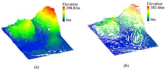 Since the ISPRS data were collected almost two decades ago, the average point density was relatively low ranging from 0.08–1 . Recent advances in LiDAR technology allow continuous improvement of point density. To further test the performance of the proposed algorithm on high density of point cloud, data with an average point density of 31.12 were used. The data were obtained in 2018 using an unmanned aerial vehicle laser scanning system (SZT-R250) flying about 50 m above the ground level. The data were obtained over 35 ha, 10,912,743 points in total (including 1,749,516 ground points and 9,163,227 non-ground points), and elevations ranging from 0 m to 398.82 m, including the steep slopes, vegetation on hillside and discontinuities which are all typical features of the terrain in mountainous regions, as shown in Figure 2. We produced the reference data using a widely adopted method, which classifies point clouds into ground points and non-ground points by automatic classification tool in Terrasolid, and then the filtering results were further improved manually, through a repeated process in which the results were checked and rectified to ensure accuracy [50,51,52]. Although the classification results of the reference data are not completely accurate, the misclassification in reference data is much lower than that of the automatic filtering results [53]. Thus, in this study, we assume that the reference data is a correct classification of the LiDAR data.