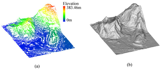 Construction result of initial provisional DTM. (a) Ground seed points, (b) initial provisional DTM.