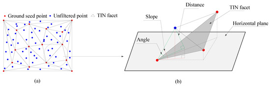 Step4: Calculate the distance to the TIN facet and the angle to the vertex. If both computed values are lower than the maximum distance () and the maximum angle (), then the unfiltered point is labeled as a ground point.