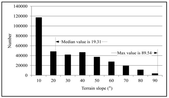 In this study, the maximum angle () is determined by statistical analysis, which is inspired by the work by Axelsson [36]. Statistic from initial provisional DTM is collected in the form of a discrete histogram of the terrain slopes, as shown in Figure 10. Finally, based on the median value, which is the value separating the higher half from the lower half of a data sample (a probability distribution), is determined from this histogram.