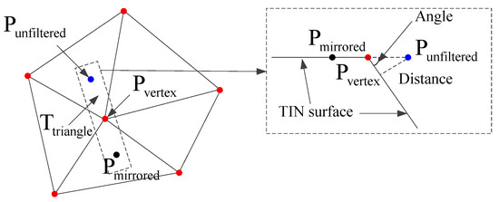 Step3: The mirrored operation is illustrated in Figure 12. Find the vertex with the highest elevation value in the corresponding TIN facet of an unfiltered point . The mirrored point of is calculated as follows: