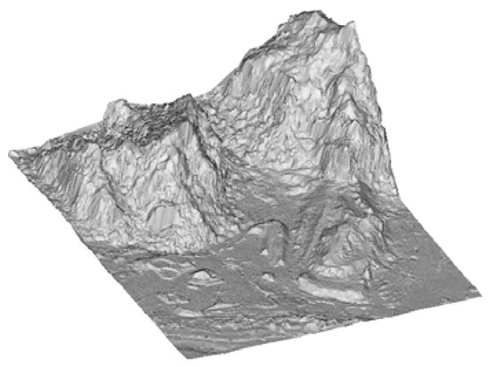 This method simulates the physical process of cloth-touching objects. After a cloth drops on an inverted (upside-down) landscape, the final shape of the cloth can be confirmed and regarded as an approximated terrain, as shown in Figure 4.