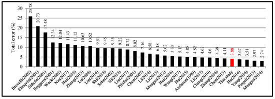 Figure 14 shows the accuracies of the proposed algorithm under CR = 0.5 m against other 31 algorithms [2,24,25,26,27,31,32,33,34,37,38,41,42,43,44,47,54,55,56,57,58,59,60,61]. The average total error of the proposed algorithm under CR = 0.5 m provides competitive performance, below four filtering algorithms, but above 27 other algorithms. Four filtering algorithms with higher accuracy are discussed in Section 5.3.