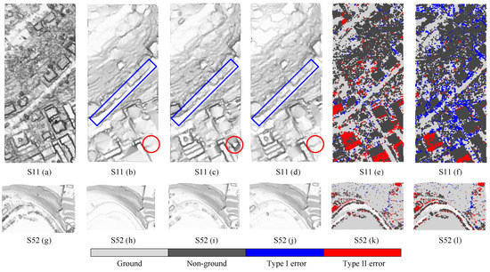 Figure 17 shows the DTMs and the space distribution of type I and II errors (SDEs) generated by the proposed algorithm under CR = 0.5 m and CR = 1 m in several representative samples, which are named as , , and . S11 has a considerable slope change, and many mixtures of buildings and vegetation are on the hillside. The visualizations of and exhibit similar appearances. Exploration of further details for some recognizable differences between them shows is closer to the reference DTM than in the terrain discontinuities, as shown in the rectangle regions in Figure 17b–d. However, compared to , there are more non-ground objects in , as shown in the circle regions in Figure 17b–d. Compared to , shows lower type I error but higher type II error. The reason can be explained by exploring the procedure of CS. When cloth gradually approaches terrain with more cloth particles, a more detailed initial terrain is constructed, thereby assisting PTD to correctly classify the ground point in complex terrain. However, the ground seed points are not 100% correctly obtained by CS. Thus more seed points will increase the risk of type II error. For S52, the ground surface has many abrupt changes. In comparison with the reference DTM, and can effectively preserve the steep and terraced slopes.