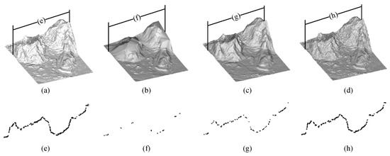 Comparison of DTM generated by PTDF, CSF and our algorithm. (a) Reference DTM, (b) DTM generated from PTDF, (c) DTM generated from CSF, (d) DTM generated from our algorithm. Filtering results for the cross-section for (e) reference data, (f) PTDF, (g) CSF, and (h) our algorithm.