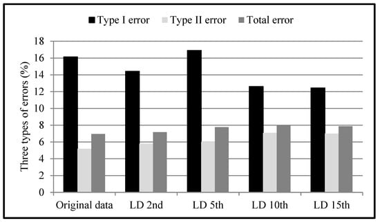 An awareness of the relationship between filtering algorithms and point density helps to balance the processing speed and filtering accuracy [53]. To analyze the effect of point density on the proposed algorithm, the low-density versions of original LiDAR data were generated using a simple point thinning algorithm, keeping only every nth (for example, the 10th) point along the time line from the original LiDAR data [62]. In this study, we used every 2nd, 5th, 10th and 15th points from original LiDAR data and generated a series of low-density versions with average point density of 15.56, 6.22, 3.11and 2.07 (named as LD 2nd, LD 5th, LD 10th and LD 15th). As shown in Figure 20, it can be seen that point density has relatively less effect on the filtering results. Specifically, the root mean square errors (RMSEs) of the type I, type II and total errors are 2.02%, 0.81%, and 0.45%, respectively. Additionally, there is a general tendency for the type II error to be slightly negative. The possible reason is that the effect of the type II error from high-density data is limited because non-ground points are surrounded closely by ground points [63]. In terms of the type I error, the proposed algorithm does not show a recognizable tendency.