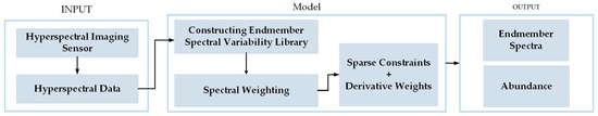 Linear mixture model or nonlinear mixture model are common models when modeling mixed pixels. Generally speaking, the linear mixture model is regarded as mixtures for which the pixel components are homogeneous surfaces in spatially segregated patterns. On the contrary, the nonlinear mixture model takes the intimate association or interaction with more than one component into account [24]. Most algorithms prove that the linear mixture model is an effective model which can meet the accuracy requirements. The linear model conforms to the formation mechanism of hyperspectral image. In this paper, the proposed algorithm model will be introduced based on the linear mixture model. Figure 1 shows the schematic overview of the proposed method.