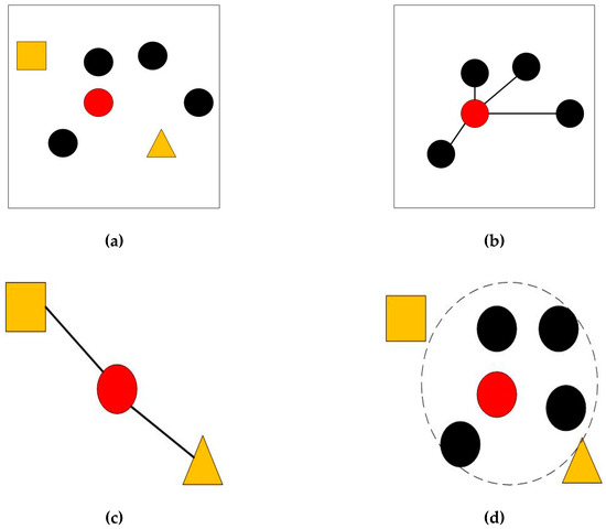 (a) The red circle assigned to be center point has six neighbors; (b) The red circle and the black circles belong to the same class; (c) The red circle and the yellow rectangle and triangle do not belong to the same class (d) After the maximum margin criterion (MMC), the samples in the same class become more compact.