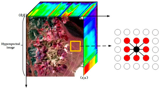 Derivative analysis and local neighborhood weights are merged into local neighborhood derivative weights in the proposed method. First-order derivative spectrum is brought into modeling local neighborhood weights. The local neighborhood derivative weights act as regularization terms to penalize different abundance vectors. The first law of geography is expressed as “Everything is related to everything else, but near things are more related than distant things” [40]. Inspired by the first law of geography, the hyperspectral image is divided into multiple local windows. Figure 4 displays the diagram of the local window. It is assumed that the hyperspectral image with r×s pixels (r represents the length of the image; s represents the width of the image) is arranged on r×s circles. The spatial coordinate of the top left corner circle is (0,0), and the spatial coordinate of the bottom right corner grid is (r,s). In Figure 4, a black circle and red circles constitute a local window where the black circle represents central pixel and red circles represent neighboring pixels. Suppose that pixel , represented by the black circle, is set as the central pixel of the local window in Figure 4. If the pixel , represented by the red circle, is the neighboring pixel of pixel , we define . If the pixel , represented by the colorless circle, is not neighboring pixel of pixel , we define