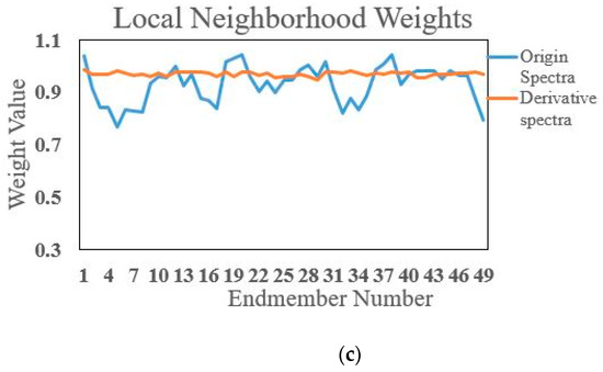 Noted that the spectra of rock extracted from hyperspectral image vary in Figure 5. One of the rock spectra is selected as reference spectrum. Reference original spectrum and other original spectra are used to compute local neighborhood weights according to Equation (13). The same arithmetic operation works on reference derivative spectrum and other derivative spectra. The results are shown in Figure 5c. The conclusion that local neighborhood derivative weights are insensitive to ESV can be obtained by comparing with results of original spectra and derivative spectra.