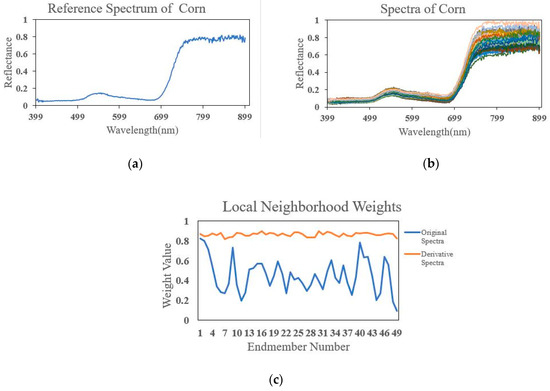 Third, in addition to spectral weighting matrix, local neighborhood derivative weight is introduced into the proposed method to reduce the effect of ESV on spectral unmixing. Derivative analysis is used to convert the original hyperspectral data into new spectral feature values with smaller intra-class differences and larger inter-class differences for spectral unmixing. The first-order derivative of spectrum is adopted to obtain the spectral feature values in the proposed method. Local neighborhood weights prove to enhance the performance of the spectral unmixing algorithms [28,60,61]. Local neighborhood weights characterize the degrees of similarity of pixel pairs. The higher the similarity between pixels is, the more similar the corresponding abundances are. In fact, the local neighbor weights vary due to the influence of ESV. The change in local neighborhood weight between pixel pair affects the corresponding abundances. Hence, derivative analysis and local neighborhood weights are merged into local neighborhood derivative weights in the proposed method. The first-order derivative of spectra of pixel pair are adopted to model local neighborhood derivative weights. Figure 5 shows that local neighborhood derivative weights are insensitive to ESV. To prove the generalization of the fact, the spectra of corn and rice are intercepted from Figure 8. Note that the spectra of corn and the spectra of rice vary in Figure 15b and Figure 16b, respectively. One of the spectra is selected as reference spectrum. The original spectra and derivative spectra are used to compute local neighborhood weights according to Equation (13), respectively. The results are shown in in Figure 15c and Figure 16c, respectively. By comparing the local neighborhood weights between original spectra and derivative spectra, local neighborhood derivative weights are insensitive to ESV.