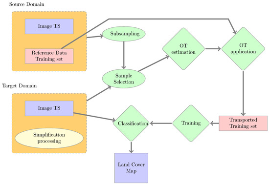 For land-cover mapping, OT is a pre-processing step as it aims to adapting the data distributions. Then the full procedure follows four major steps: