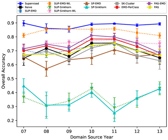 Figure 4 and Figure 5 allow a quick comparison of the OA obtained using the different methods. Two types of analyses are carried out: first, baselines using reference data of both domains and, second, using only the reference data of the source domain. Baseline methods where samples are controlled allow defining the trends that can be expected from OT in the best cases. The SUP-Sinkhorn case thus highlights the inefficiency of the algorithm, which is explained by the complexity of the used data: there are too many classes for optimal minimization.
