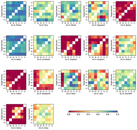 Before considering the performance obtained by PAS-EMD, the FScore obtained by the naive classification is shown as it represents the lower baseline in this work. Figure 6 represents heat maps, where the color scale gives the FScore value. The source domain (the year of the trained model) is given on the x-axis, the target domain (the year of the produced land-cover map) is given on the y-axis. This figure shows that three categories of FScore are obtained, the first showing very high FScore values for all pairs of years (blue values), the second, at the opposite, very low FScore (red values) and the last, with average FScore depending on the considered years. Broad-Leaved tree and maize are majority classes and geographically stable in our data, which explains the excellent FScore obtained for all pairs of years. The worst FScore values are obtained with minority classes such as hemp or soybean. Several classes are known to be highly confused with majority classes such as barley being confused with wheat or sorghum with maize, which could explain the low FScores observed on these classes The heat maps are not symmetric. There is not a unique optimal pair of years for all classes shared by all the methods. These results are consistent with global analysis.