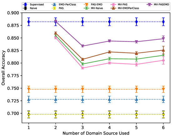 The previous results are obtained using only one source domain at the same time. We investigate here the use of majority voting (MV) to use several source domains to predict one target domain. Figure 8 represents the OA obtained (on the y-axis) depending on the number of source domains used for voting (x-axis). Two kinds of curves are presented, the horizontal lines representing methods using only one domain source as input, and the full curves representing the MV performance. The horizontal lines correspond to the mean values over all source domains from Figure 4. The reference cases are the supervised (blue dashed line), the naive (black dashed line) and the PAS (yellow dashed line) cases which are mostly confounded. The two methods providing the best results are considered to be input for voting: EMD-PerClass (light blue dashed line) and PAS-EMD (orange dashed line) and are also shown for reference. Then, the MV is applied using the maps produced with these methods. The naive case maps are used to produce the MV-Naive maps, and this is also the case for the other methods. Then the OA shown are the MV-Naive (green curve), the MV-PAS (pink curve), the MV-EMD-PerClass (brown curve) and finally the MV-PAS-EMD (purple curve).