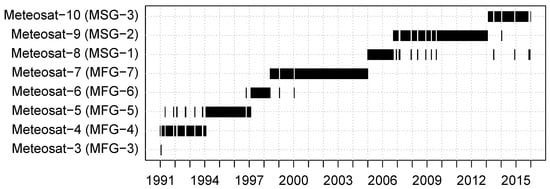 The COMET CFC CDR was produced by using the MVIRI sensor on Meteosat 3–7 and the Spinning Enhanced Visible and Infrared Imager (SEVIRI) sensor on Meteosat 8–10, as visualized in Figure 1. MVIRI is a radiometer that measures the Earth’s disk every 30 min in 3 spectral bands (the so-called Meteosat heritage channels) covering visible and infrared wavelengths: the broadband Visible channel (VIS, 500–900 nm), the Water-Vapor absorption channel (WV, 5.7–7.1 m), and the thermal Infrared channel (IR, 10.5–12.5 m). Only the VIS and IR channels were used since the WV band has limited power for cloud detection. SEVIRI scans the Earth’s surface every 15 min in 12 spectral channels ranging from the visible to the thermal infrared. For SEVIRI, we employed only the two visible channels (560–710 nm and 740–880 nm) to simulate MVIRI’s broadband VIS channel and the thermal infrared channel (9.8–11.8 m) to most closely “mimic” Meteosat heritage channels on MVIRI. The new International Satellite Cloud Climatology Project (ISCCP) H-series algorithm follows the same strategy of “downgrading” several satellite types and generations to a common set of two (one VIS and one IR) channels [,].