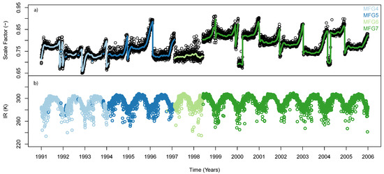 COMET employs re-calibration coefficients for the IR channel covering the whole Meteosat First Generation archive. They were developed by EUMETSAT by use of the High-resolution Infrared Radiation Sounder (HIRS) on board the NOAA polar platforms as reference measurements []. The method of re-calibration was built upon the GSICS methodology, mainly for collocating the Meteosat measurements with reference measurements. However, the method generates new calibration coefficients, which enables computing radiances from the raw Meteosat measurements (counts). The GSICS method computes a radiance correction to operational Meteosat radiances. Figure 2 visualizes the re-calibrated IR FCDR covering Meteosat-4–7 during 1991–2005. Only the historical MFG MVIRI period is shown for illustration since for MSG SEVIRI, the original calibration coefficients were used. The daily re-calibration coefficients (scale factor and offset) were smoothed with a 10-day Gaussian filter (Figure 2a; only the scale factor is shown). Diurnal variations in calibration were not accounted for since inter-calibration was performed against a polar-orbiting instrument and variations were not significant for spin-stabilized satellites. The result were stable brightness temperature time-series, as shown for the 15-year period over a desert pixel in Figure 2b. Compared to the original (non inter-calibrated) coefficients, the difference from MFG MVIRI to MSG SEVIRI was reduced from 1.83–0.28 K for the IR channel. The remaining difference was largely attributable to spectral and collocation differences between the two sensors [] (Section 3). The long-term stability of the FCDR was further documented in []. The FCDR also guarantees a high decadal stability of <0.8 K/decade for the Meteosat-derived Land Surface Temperature (LST) CDR []. For the MVIRI solar channel, calibration factors were used as published by [,]. For MSG SEVIRI, the original VIS and IR calibration coefficients from EUMETSAT as part of their Level 1.5 files were used.