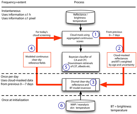 The careful reader may now object that there is no clear-sky reference and no cloud-screened clear-sky observations to fit a diurnal cycle model at the very beginning of the processing. However, the cloud detection requires that reference to be present as advocated above. Therefore, how can we get a clear-sky reference without having clear-sky observations in the first place? This chicken-and-egg problem is solved by injecting four NWP-based skin temperature values (for 0, 6, 12, and 18 UTC) at the very start of a processing and after very long periods (more than 7 days) of permanent cloud coverage (Number 6 in Figure 3). They were corrected for subgrid-scale elevation and augmented with the effect of water vapor and view zenith angle, so that they better corresponded to clear-sky ToA brightness temperature values. They constrained the diurnal cycle brightness temperature model on the first day and thus served as the initial clear-sky reference. This also means that with the absence of a clear-sky reflectance, the initial cloud screening used IR-only information. After 1–7 days of spin-up, enough clear-sky reflectance and brightness temperature observations were collected, and the cycle could run in a self-contained mode for reflectance and brightness temperature. For periods with >7 days of permanent cloud cover, NWP-based skin temperature was re-ingested during processing. Due to the high temporal sampling of Meteosat, this measure was only rarely necessary, making 7 days the maximum needed integration period. The integration period could be further reduced by looking forward and backward in time (and not just backward) for clear-sky pixels.
