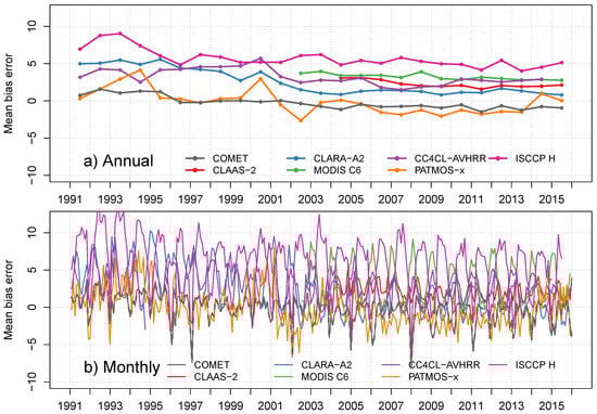 Figure 7 is reproduced from [], but adds the new International Satellite Cloud Climatology Project (ISCCP) H [,] dataset (monthly mean cloud amount at one degree of spatial resolution) for inter-comparison. It displays the temporal evolution of yearly (a) and monthly (b) MBE averaged over the 237 SYNOP validation sites. The trend in bias of COMET was −0.94% per decade. This value lies between the GCOS-defined stability requirements for thick and thin clouds. This negative trend is related to the overestimation of CFC before 1996 and to a statistically-detectable break in 1996 (standard normal homogeneity test for a 95% confidence level [,]).