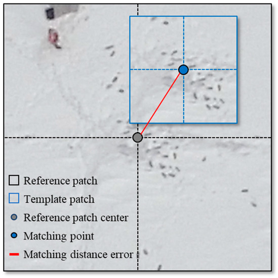 The matching distance error (MDE) is an indicator that explains the accuracy of image matching. This indicator is introduced to compare objectively the similarity measures of the matching costs with different units and ranges [19]. If the patch images are generated around the back-projected image points for a true object point and then matched to each other, the matching point with the maximum similarity should be placed at the center of the reference patch image. However, the actual matching point may not be the same as the center of the reference patch image. This is due to the size of the template patch image and the performance of the matching cost. Therefore, we define the matching distance error as the distance between the matching point and the center point in the reference patch image (Figure 1). In this study, the reference patch image is generated from the original image in which the line-of-sight vector direction for a given object point is the closest to the nadir direction. This is because the difference of relief displacement between two images has to be small for image matching to be reliable.