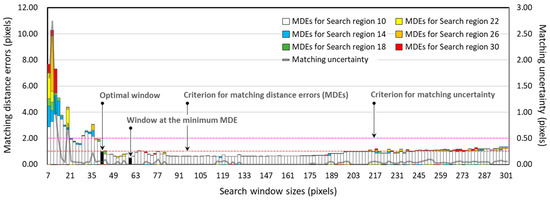 In this study, we define the optimal search window by the minimum window size that satisfies the two criteria of matching distance error and matching uncertainty. To decide the criteria for a given object point, matching distance errors are measured by applying different search window sizes and search region sizes (Figure 2). Search window sizes are set from 7 × 7 pixels to 301 × 301 pixels, with 2-pixel intervals. Search region sizes are defined by increasing each search window by 10, 14, 18, 22, 26, and 30 pixels. For example, the search regions for the search window of 7 × 7 pixels are set to 17 × 17, 21 × 21, 25 × 25, 29 × 29, 33 × 33, and 37 × 37 pixels. In this study, a series of search regions, defined in this way, are named search region 10, 14, 18, 22, 26, and 30, respectively (Figure 2). From these measurements, the optimal window is determined by the smallest search window, whose difference between the matching distance error and the minimum error is less than 0.5 pixels and matching uncertainty is less than 0.5 pixels. Note that this approach can only be applied to correct object points for the evaluation of matching costs.