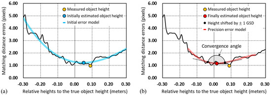 The height error is proposed to evaluate the accuracy of matching costs, which is defined as the difference between the true object height and the estimated object height. In this study, we obtain the true heights of object points from a laser scanner dataset, because a Global Positioning System (GPS) survey is impossible on drifting sea-ice. More details of this procedure are described in Section 3.2. On the other hand, the heights of object points are estimated by two-step modeling. First, an initial model is established for a predefined height adjustment range, and the initial height of the object point is estimated by measuring the minimum error in the initial model (Figure 3a). Then, a precision model is established for a narrower height adjustment range, and the final height of the object point is determined from the precision model (Figure 3b). The height adjustment range for the initial model is set from −0.3 m to 0.3 m around the height, with the minimum error measured. The height adjustment range for the precision model is set from −0.2 m to 0.2 m around the initially estimated object height. This approach is designed to better reflect the reduction tendency of matching distance errors.