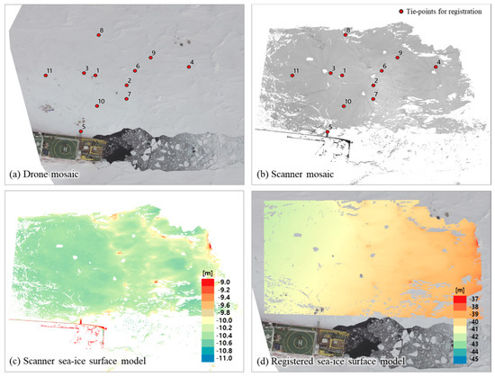 Registration between the drone and scanner datasets. (a) Drone mosaic, (b) scanner mosaic, (c) scanner sea-ice surface model, generated from the scanner point cloud data [19], and (d) registered scanner sea-ice surface model.