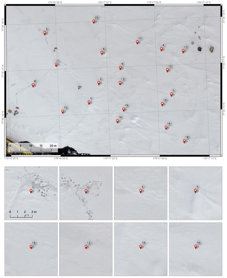 From the drone mosaic and the registered scanner sea-ice surface model, a total of 20 analysis points were extracted. Through visual inspection, the analysis points were divided into textured points (1st to 9th points) and low-textured points (10th to 20th points). These analysis points are considered ground truth data with true heights and are used to measure performance indicators. Figure 6 shows the locations of the analysis points and several examples with different surface textures.