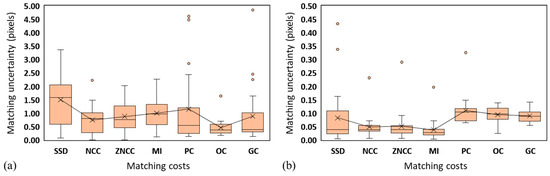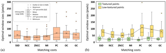 The robustness of image matching to low-textured surfaces was evaluated using the optimal search windows, measured for the analysis points. The optimal window sizes showed a large increase in the low-textured points (Table 1 and Figure 7). In the textured points, the differences between matching costs were small, whereas in the low-textured points, the window sizes of the image domain costs were smaller than those of the frequency domain costs (Figure 7b). Among the image domain costs, ZNCC showed the smallest window sizes, whereas SSD showed a relatively large increase in search window sizes due to the decrease in surface textures.