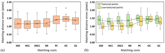 Statistical distributions of the matching distance errors. (a) Error distribution for all analysis points, and (b) error distributions for each of the textured and low-textured points.