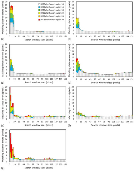 Matching distance errors measured from different search windows and search regions for the 7th analysis point. (a) SSD, (b) NCC, (c) ZNCC, (d) MI, (e) PC, (f) OC, and (g) GC.